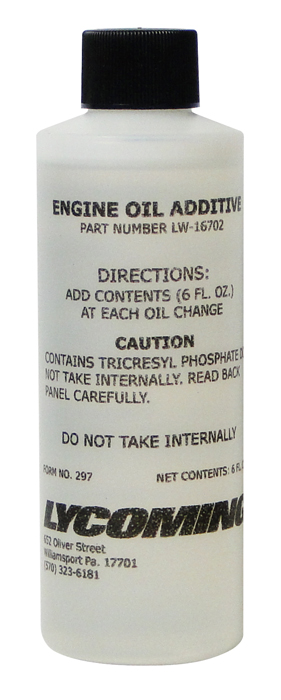 Avco Lycoming has approved oil additive LW-16702 that contains an anti-scuffing agent and can dramatically reduce engine wear. This additive is applicable to all Avco Lycoming piston aircraft engines, and factory recommends use at every oil change or every 50 hours, whichever occurs first. For 6-8 qt. sump, use one 6 oz. can, for 12-15 qt. sump, use two 6 oz. cans, for 17-19 qt. sump, use three 6 oz. cans, for 23 qt. sump, use four 6 oz. cans. |