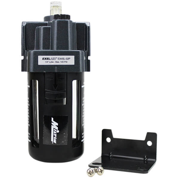 EXELAIR by Milton’s Simply Better Air® system provides the best solution to manage compressed air. This 1/4" NPT Air Lubricator features a Polycarbonate bowl with a capacity of 4.56 oz. FRL Lubricator delivers a consistent mist of oil through the airline and extends tool life. Oil amount is easily adjusted by rotating dial at the top of the unit. FRL Lubricator can be refilled either by removing bowl or filling through oil fill cap on top. Max Air Flow of 175 CFM and a max operating pressure 145 PSI. Includes mounting bracket and hardware. |
