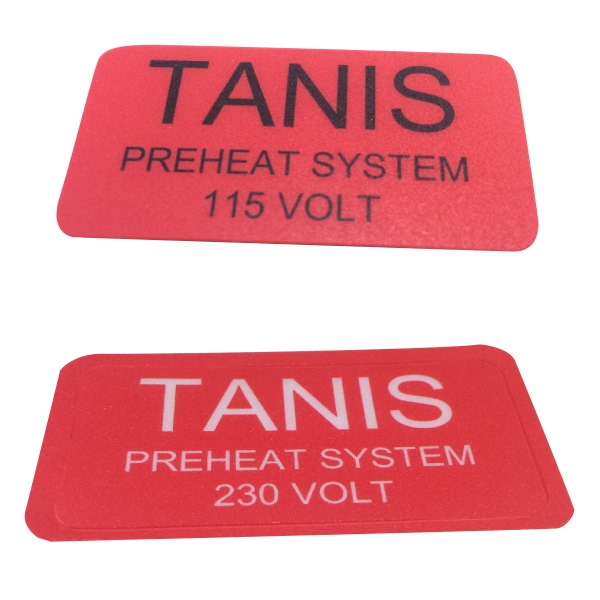 | Placard for Tanis 115 or 230 Volt Systems Material Description: 0.010" thick velvet polycarbonate with a 0.005" thick permanent adhesive that is resistant to most aviation fluids. |