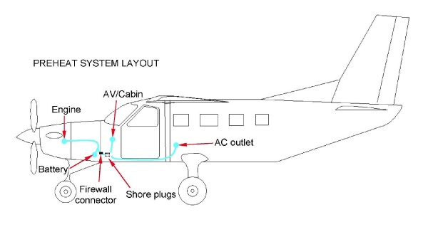 This preheat kit contains pad heat elements for turbine engine preheat, Battery heat, and an Avionics/Cabin Heater. This multipoint configuration fully preheats the engine, battery, cabin, and avionics. Power is routed to the elements through a dedicated wiring assembly with LED system power indication and circuit overload protection standard. The system is self-regulating through design. Heated components reach an average state of thermal equilibrium in approximately six hours. This preheat kit when installed will supply 533 watts to the engine with a 2.3 amp draw at 230 volts. When the battery heaters are also included you get 637 watts at 2.8 amps at 230 volts. The Avionics heater is powered by a separate circuit and is 500 watts with an optional interior convenience outlet. |