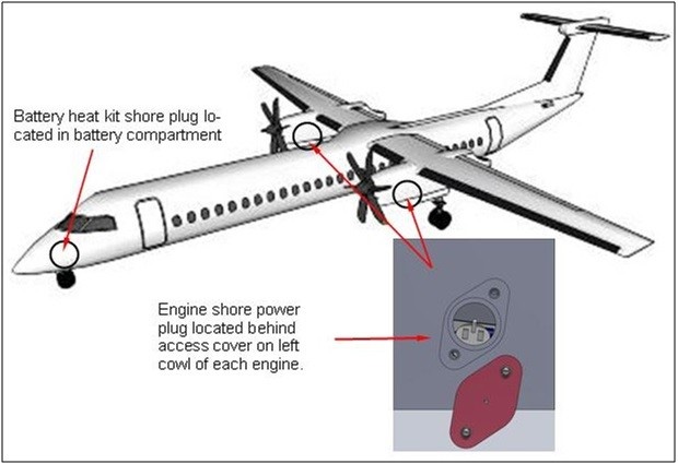 Pratt & Whitney DHC-8 (Q400) | A complete aircraft system supplies 2838 watts with a 24.6 amp draw at 115 volts. Each engine is supplied with 1315 watts with a 11.4 amp draw at 115 volts. The 3 batteries are supplied with 208 watts with a 1.8 amp draw at 115 volts. | Fixed Wing Preheat System - DHC-8 Q400 PW150 - 115 Volt | 05-14781 | $11000.00 | |