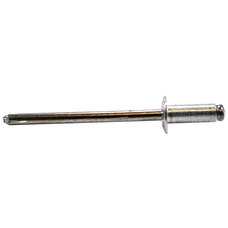 | P60476 Aluminum Rivet - Aluminum Mandrel. 1/8 diameter x 1/4 head x 1/8 x 3/8 range. Blind open end pop rivets are available in a variety of sizes, types, and materials to fit most any application. Simple three step riveting make quick work of most any fastening job. These open end rivets resemble conventional tubular rivets when set, but retain the mandrel within the rivet body for added strength. |