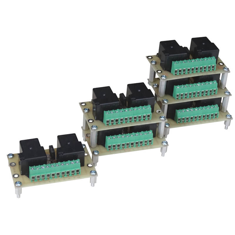 AE Relay Boards - Better than the Competition These relay contacts are protected against inductive sparking generated from relays switching inductive loads such as motors and solenoids. The relay coils are also protected. This prohibits the relays from early failure. This also protects the switch contacts that drive the relay coils from failure. 20A Relay - (available in 12V to 14V or 24V to 28V operation) and available in in 1 Axis, 2 Axis or 3 Axis control. Stack up to 3 relay boards to save panel space. Terminals are easily accessible. Each board contains two, SPDT relays (Form C). Each relay has one normally closed contact and one normally open contact). Each relay board is 3.3" wide by 2". The single board overall height is 1.3" high. The relay coils are actuated by pulling them down to common or ground. If you desire to operate them pulled up to + bus voltage, special order requests can be accommodated at no additional charge. |