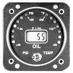 | The OPT-1 is a dual instrument which features dual 90º graphic analog displays. Select to view pressure or temp. on the digital display using the toggle switch on the front panel. OTP-1 measure to 1 PSI and oil temp. to 1 F on the digital display. Incorporates an external pressure transduc- er and temperature probe that are mounted in the engine compartment. Instrument is backlit for night operation and operates on 12 or 24V system. Oil pressure range is 25-100 PSI and oil temp. range is 65°-240°F. Wt. 22 Oz. |