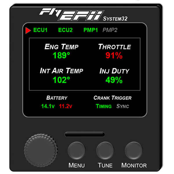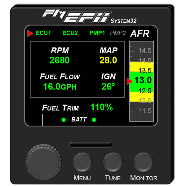 | The FlyEFii System32 Engine Management System Hardware is the first electronic engine management system ever designed specifically for the needs of experimental aviation. System32 is a state of the art, high speed, fully redundant system that represents the fulfillment of a ten year wish list of functionality. Dual 32 bit high speed ECUs and a sunlight readable graphical LCD Cockpit Controller combine for seamless power and efficiency in managing your engine's electronic fuel injection and electronic ignition functions. System32 will be offered in ignition only and full ignition + injection versions. |