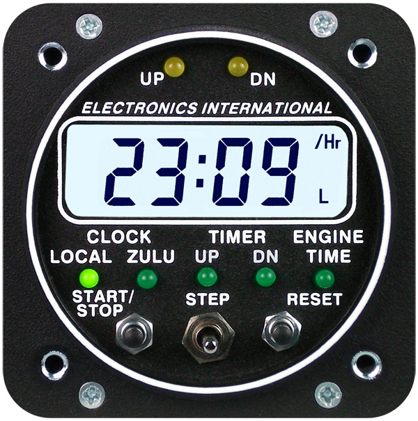 | May be set to display in a 12 or 24-hour format. Displays Zulu Time. A 10-year lithium battery keeps the clock running even if the aircraft battery is removed. Displays an Up Timer. This Timer will start running when the engine is started. In this manner the Timer acts as an automatic Flight Timer. The Up Timer may be started, stopped or reset. A Recurring Alarm may be set to alert you at appropriate time intervals. Example: If the alarm is set for 30 minutes, you will get an alarm at 30 minutes, 60 minutes, 90 minutes, etc. This alarm can be used to remind you to check your fuel level or switch tanks at set time intervals. Displays a Down Timer. This Timer counts down from a programmed start time. The Down Timer may be started, stopped or reset. Warning lights above the LCD display will blink if the Up or the Down Timer times out. Displays an Engine Timer. This Timer acts as a Hobbs Meter. When the engine starts, the Engine Timer will run. The Engine Timer displays total engine time in hours, tenths and hundredths of an hour. E.I. products include all documentation and certifications |