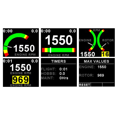 The RPM-2 is a 3 1/8” sunlight readable color display instrument providing two universal RPM inputs that is primarily intended to measure engine and/or rotor RPM. The display can be configured to display single or dual RPM or it can be configured to display engine and rotor RPM as used in helicopters and gyroplanes. The RPM-2 also has a maximum values display screen as well as a handy magneto check function. The RPM-2 includes a number of timers such as a Hobbs meter which can be set to the current engine time and is also password protected, an engine running and flight timer as well as a programmable maintenance timer to schedule routine engine maintenance. The RPM-2 can also be interfaced via the CAN bus to an external RDAC unit (Remote Data Acquisition Unit). This allows for easier installation as the RDAC unit is normally mounted in the engine compartment. |