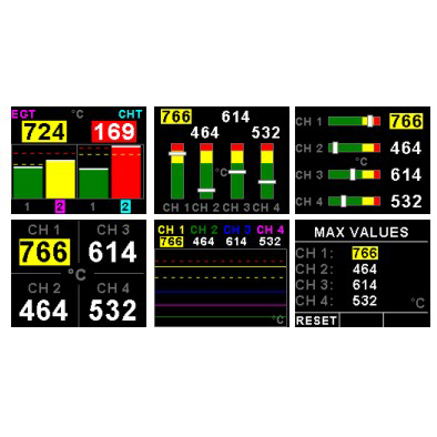 4-channel Thermocouple (EGT/CHT) Monitor The TC-5 is a 3 1/8" Sunlight readable 4 channel thermocouple color display instrument. Instrument can be configured for 5 different temperature display screens. The display can be configured to group EGTs and CHTs to common settings or each thermocouple channel can be independently displayed with individual programmable high alarm and probe type. The TC-5 also has a trend graph and maximum values display screen. The TC-5’s high accuracy is due to its built in thermocouple linearization curves and cold junction compensation techniques. Temperature probes can be common J, K or E type thermocouple probes as used in CHT and EGT senders. Temperatures can be displayed in degrees Celsius or degrees Fahrenheit from -100ºC to 1200ºC (-148ºF to 2192ºF). The TC-5 also features a built in engine leaning facility which allows the pilot to optimize the fuel mixture according to peak EGT temperatures as well as a cruise mode facility to provide instant identification of changing EGT/CHT trends. The TC-5 can also be interfaced via the CAN bus to an external RDAC unit (Remote Data Acquisition Unit). This allows for easier installation as the RDAC unit is normally mounted in the engine compartment. |