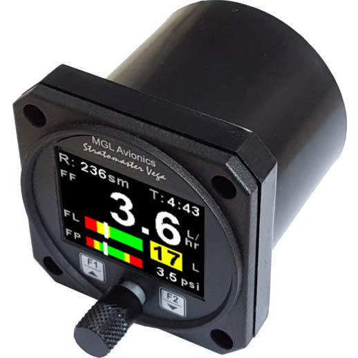 The FF-4 for Experimental / LSA aircraft is a 2 1/4” sunlight readable color display instrument intended for efficient monitoring of fuel related information for single or dual fuel tanks. The FF-4 has many display configurations based on single/dual flow senders, single/dual level senders and a fuel pressure sender. Full functionality is available with a fuel flow and level sender or only with a fuel flow sender using calculated fuel levels based on fuel usage. Differential fuel flow calculations are also supported for fuel return systems. Fuel injector systems are also supported. Standard automotive fuel level senders can be used, even with odd shaped tanks due to a comprehensive, multi-point calibration system. Most fuel flow senders can be used as the K-factor of the sender can be entered into the system for simple calibration. In addition, the FF-4 can use the actual ground speed from a RS232 NMEA enabled GPS receiver to determine fuel range. The FF-4 can also be interfaced via the CAN bus to an external RDAC unit (Remote Data Acquisition Unit). This allows for easier installation as the RDAC unit is normally mounted in the engine compartment. |
