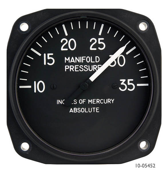| Manifold Pressure Gauge. Engineered for durability, this pressure gauge utilizes an internal bellows system to measure the absolute pressure of the aircraft engine intake in inches. |