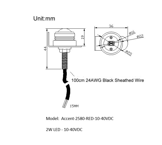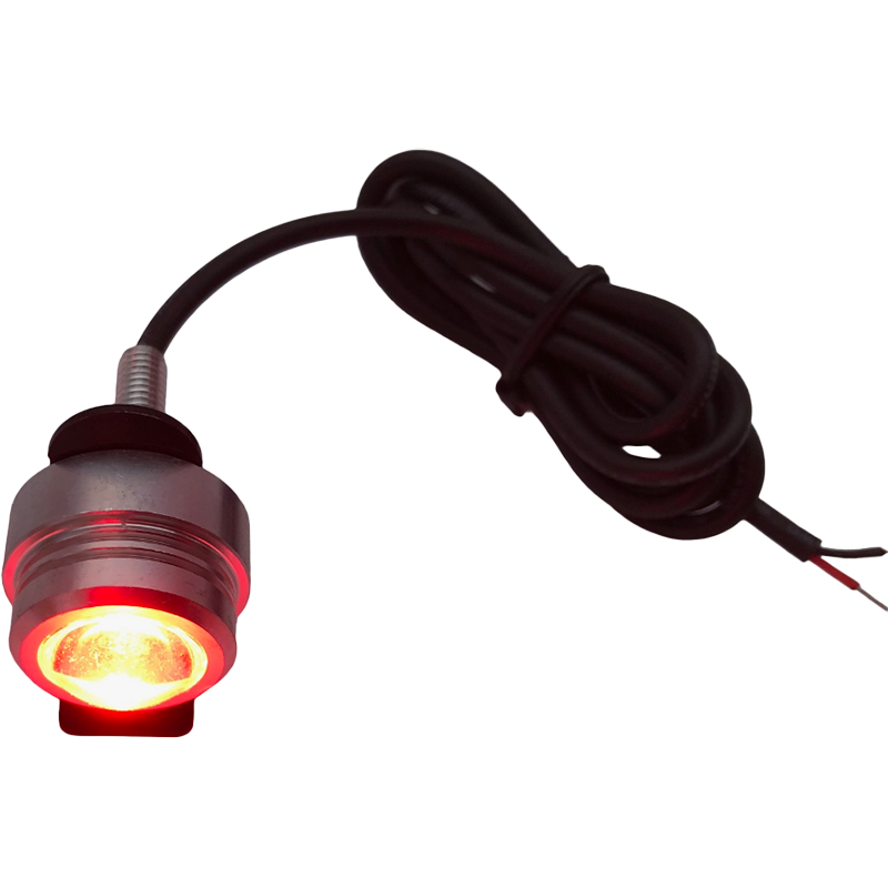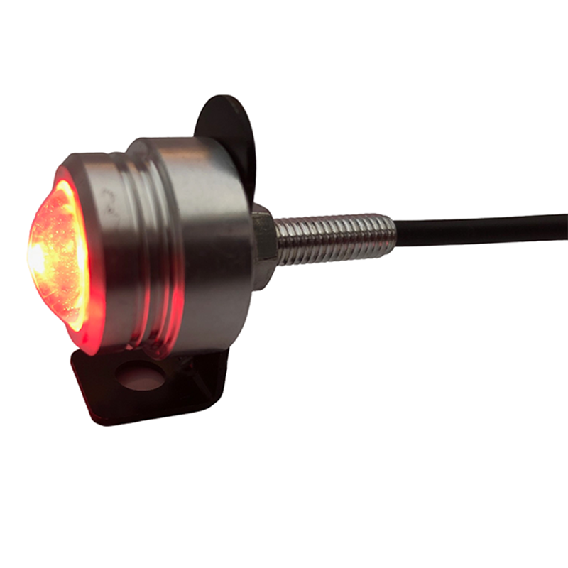 2W Red LED Broad lighting pattern 10-40VDC Aluminum housing and 90 degree bracket. It can be removed from the bracket for mounting if needed. Note: it is a multi-voltage (10-40VDC) so it is not dimmable. Dimensions: 1" x 1.1" (without bracket) |