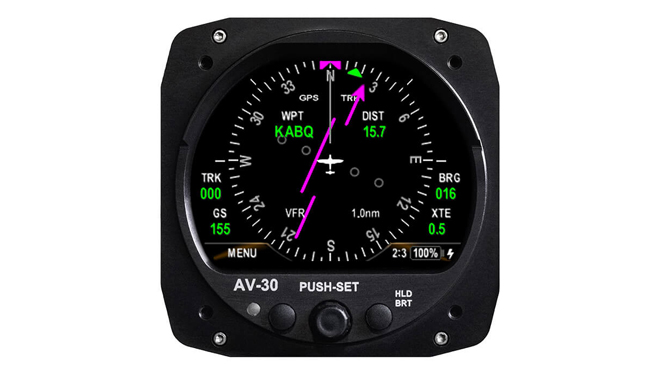 This data can be overlayed in the textual fields as desired and is used to create the compass rose (GPS Track), moving map display (ARC Mode), and create the GPS HSI presentation when the AV-30 is operating as a DG instrument. When operating as an attitude indicator, it can drive the direction tape and provides a bearing-to indicator.