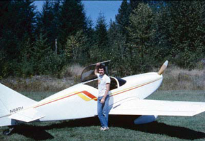 Tom had entered the University of Washington with an interest in business. He received a degree in this and went into the science side of the school for dentistry. After working a year and a half as a volunteer in a dental clinic, he realized “that clearly wasn’t what I was being called for”, and he switched over to aeronautical engineering in a non-matriculating manner under two professors and the top graduate student at the school. “I studied specifically for designing aircraft that I could end up flying. Following some wind Tom Hamilton with the original Glasair I, down on the pig farm. tunnel tests at the University, my dad was gracious enough to let me start the building process in his garage.” It was an all composite aircraft that introduced Tom to the basics of vacuum bagging. He bolted a Lycoming 0-235 on it.