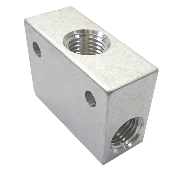 Our aluminum manifold fittings are a bolt-on design with taper pipe threads. These fittings are designed to provide a convenient means of plumbing multiple hoses from and/or to one source with the fitting being bolted to a supporting structure. This design will eliminate Adel clamps at the juncture of the hoses and eliminate additional tee type fittings when more than two hoses are to be connected to one source. Applications include brake reservoir lines, static system, suction systems, fuel systems, air line pigs, smoke systems, and more. Not for use on oxygen systems or pressures over 150 psi. Basic part number on all fittings is 04-00XXX, complete the part number by filling in the last 3 digits after selecting the fitting you need according to the details below. Example: 04 -00102. First Code Number - Determines the style of the fitting. -1: One port in the end with two ports out, 90° cross drilled with one port per side. 3 ports total. Two Mounting Holes. -2: One port in the end with four ports out, 90° cross drilled with two ports per side. 5 ports total. Two Mounting Holes. -3: One port in the end with six ports out, 90° cross drilled with three ports per side. 7 ports total. Four Mounting Holes. -4: One port in the end with eight ports out, 90° cross drilled with four ports per side. 9 ports total. Four Mounting Holes. -5: One port in the end with four ports out, 90° drilling with four ports on one side only. 5 ports total. Two Mounting Holes. Second Code Number - Determines the style of porting. -0: All the ports are the same. -1: Inlet port is one size larger than outlet ports. -2: Inlet port is two sizes larger than outlet ports. Third Code Number - Determines the inlet port size. -2: 1/8-27 taper pipe thread (NPT) -4: 1/4-18 taper pipe thread (NPT) -6: 3/8-18 taper pipe thread (NPT) -8: 1/2-14 taper pipe thread (NPT) In the example above - 04 -00102, this would be a 1/8 NPT inlet with two outlets of the same size. Example - 04 -00326, this would have a 3/8 NPT inlet with six 1/8 NPT outlets. |