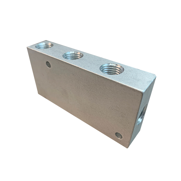 -3: One port in the end with six ports out, 90° cross drilled with three ports per side. 7 ports total. Four Mounting Holes.