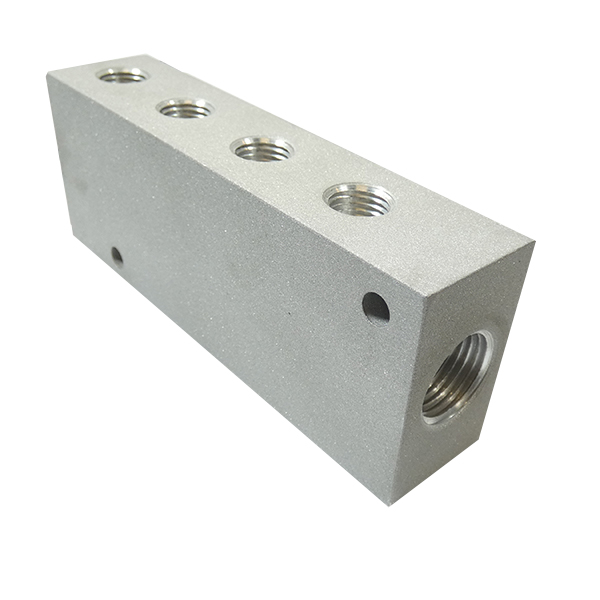 -5: One port in the end with four ports out, 90° drilling with four ports on one side only. 5 ports total. Two Mounting Holes.