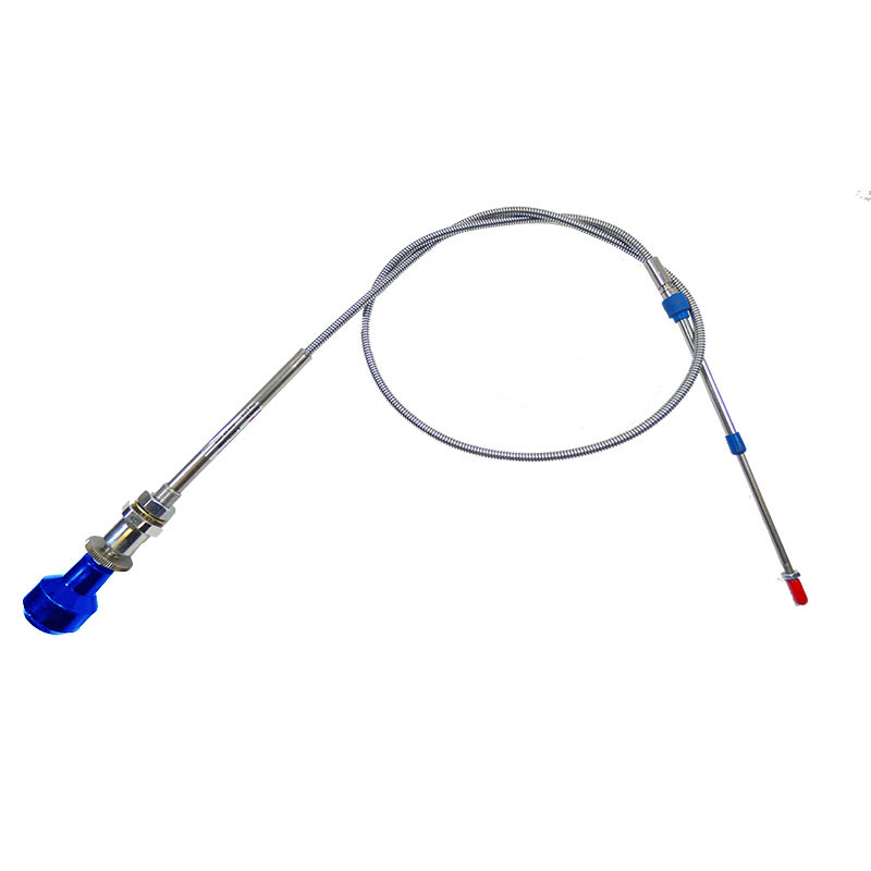 The A-800 friction lock control provides positive locking at any power setting by turning the chrome collet locking nut. Unique ball-socket construction permits 10-32 threaded end to swivel 8 degree in any direction. Casing has Teflon liner for low friction and heat resistance in high-temperature areas such as engine compartments. Travel: 3-3/8". The 1-1/4" dia. solid knob is available in black or blue (blue knob has smooth profile, not FAA style). 1/2" panel thread. Lengths are measured from under panel nut to end of threaded shaft with knob pushed in.