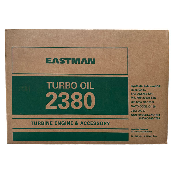 Eastman Turbo Oil 2380 is a 5 cSt synthetic lubricant that is approved against US military specification MIL-PRF-23699F STD, and UK military specification DEF STAN 91-101/2 (replaced DERD 2499).