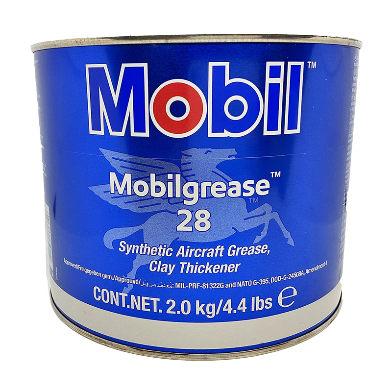 | Mobilgrease 28 is a supreme performance, wide-temperature, antiwear grease designed to combine the unique features of a polyalphaolefin (PAO) synthetic base fluid with an organo-clay (non-soap) thickener. Its consistency is between an NLGI No. 1 and No. 2 grease. It offers outstanding performance over a wide temperature range. The wax-free nature of the synthetic base fluid, together with its high viscosity index compared to mineral oils, provide excellent low temperature pumpability, very low starting and running torque, and can help reduce operating temperatures in the load zone of rolling element bearings. The clay thickener gives Mobilgrease 28 a high dropping point value of around 300ºC, which provides excellent stability at high temperatures. Mobilgrease 28 resists water washing, provides superior load-carrying ability, reduces frictional drag, and prevents excessive wear. Tests show that Mobilgrease 28 lubricates effectively rolling element bearings under conditions of high speeds and temperatures. Mobilgrease 28 has also shown excellent ability to lubricate heavily loaded sliding mechanisms, such as wing flap screw jacks. For more than 30 years, Mobilgrease 28 has been the multi-purpose grease of choice for military and related aviation applications, worldwide. Mobilgrease 28 is qualified by the U.S. Military under Specification MIL-PRF-81322, General-Purpose, Aircraft, and Specification DOD-G-24508A (Navy) for shipboard auxiliary machinery. It is a U.S. Military Symbol WTR and NATO Code Number G-395 grease. It meets the quality level of DOD-G-24508A, Amendment 4. |