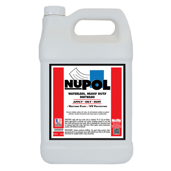 | Nuvite NuPol is a heavy-duty drywash cleaner and paint restoration polish. Cleans even the toughest baked-on carbon, and will clean turbine exhaust residue easily. And when your paint begins to dull, NuPol can be used to remove the dull, dead paint and give you a slick, bright shine once again. Can be used on dulled paint stripes, or on the whole plane without the need for water or prewashing. NuPol also leaves a UV protectant barrier to protect the paint from further deterioration from U/V. Supplied ready-to-use. |