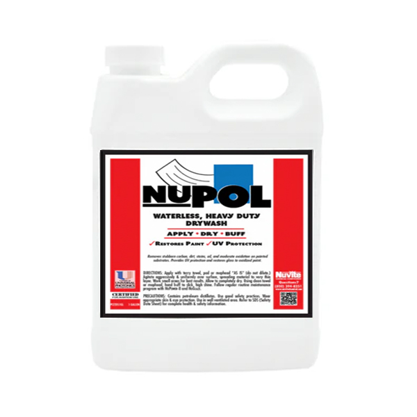 | Nuvite NuPol is a heavy-duty drywash cleaner and paint restoration polish. Cleans even the toughest baked-on carbon, and will clean turbine exhaust residue easily. And when your paint begins to dull, NuPol can be used to remove the dull, dead paint and give you a slick, bright shine once again. Can be used on dulled paint stripes, or on the whole plane without the need for water or prewashing. NuPol also leaves a UV protectant barrier to protect the paint from further deterioration from U/V. Supplied ready-to-use. |