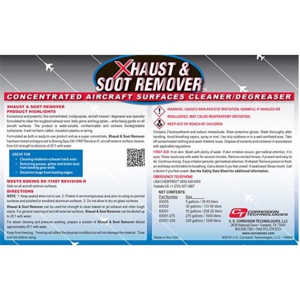 MEETS BOEING D6-17487 REVISION R Formulated as a super-concentrate, Xhaust & Soot Remover is both very economical and earth friendly! It is water soluble, nonflammable, nontoxic and biodegradeable. It will not harm rubber, insulation, plastics or wiring. |