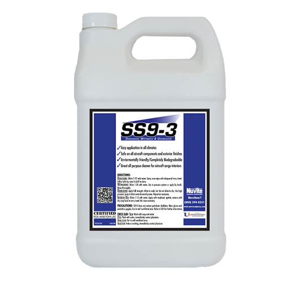 Nuvite SS-9-3 is the championship-caliber answer to the need for an effective and safe all-purpose liquid alkaline cleaner. It will clean the toughest of underbelly grease, oils and fluid leakage at full strength, or can be diluted to 1:12 to make an easy-to-use debugger and whole-airframe wipedown fluid that leaves a beautiful squeaky-clean and shiny surface that does not need to be rinsed. It works great for in-place cleaning during other airframe or engine maintenance. And, if you want to wet wash, use it in your wash water at 1:20 to make a great, non-streaking or spotting cleaner. It can even be used to clean interiors of cargo or utility aircraft. SS-9-3 is a superb product that offers great efficiency and economy due to wide usage capability and being supplied in high concentration form. And, as a bonus, it is completely biodegradable and safe to use. |