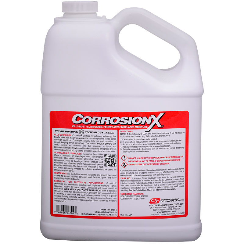 Kills Rust and Corrosion Safe on Electronics World's Greatest Lubricant, Penetrant and Anti-Seize CorrosionX is the most advanced and effective corrosion prevention compound, lubricant and penetrant in the world! Although it may look like a typical oil-based anti corrosion spray, CorrosionX utilizes a revolutionary technology called Polar Bonding that does far more than merely slow down the corrosion process like those so-called 'corrosion inhibitors'. Corrosion X actually kills existing rust and corrosion (keeping it from spreading) and provides long-term protection against rust and corrosion on any metal surface. Corrosion X is the only product available to the public that meets the US Navy's tough new corrosion prevention and control performance requirement. Corrosion Protection and Rust Preventive CoatingDue to Polar Bonding, CorrosionX causes common metals and metal alloys such as iron, steel, stainless steel, aluminum, copper, brass, bronze, etc. to chemically behave more like noble metals such as gold and platinum. In other words, as long as CorrosionX is present on metal, it can't rust or corrode! CorrosionX also has a dielectric characteristic, so it's safe on electronics and completely shuts down electrolysis between dissimilar metals. Use CorrosionX wherever you want corrosion control without paint or wax coatings. A light spray of CorrosionX on power heads, generators sets and engines a couple of times a year will keeping them looking like new even in saltwater and coastal environments. CorrosionX's unique formulation offers a multitude of advantages over conventional spray lubricants. Because it sticks to metal like a magnet, it cannot be easily displaced by pressure, friction or moisture. It lubricates under extreme loads and high temperatures. Not only does CorrosionX lubricate better, it lasts many times longer! This is especially true in outdoor, coastal and marine environments where direct exposure to rain and sea spray will quickly displace ordinary lubricants. Use CorrosionX on sheaves, hinges, locks, cable/wire rope, windlasses or any metal part needing lubrication. Unbeatable PenetrantCorrosionX also penetrates faster and further than anything you've ever used. Corroded or rusted nuts, bolts or fittings can usually be disassembled within a few minutes. Watch this time lapse video closely! Due to it's unique Polar Bonding characteristic, CorrosionX is such an incredible penetrant that it will defy gravity and climb straight up this 3" bolt!! CorrosionX is not Harmful to the Environment The volatile organic content (usually abbreviated as VOC or VOCs) of CorrosionX is only 4-7%. That's less than 1/10th what is in our competitors products (for example, WD-40 is 76% solvent). That means CorrosionX is many times more gentle on you, your equipment and the environment. In addition, CorrosionX is nontoxic, non-carcinogenic, and it's nonflammable when not in aerosol form (our environmentally-friendly propellant is flammable however).