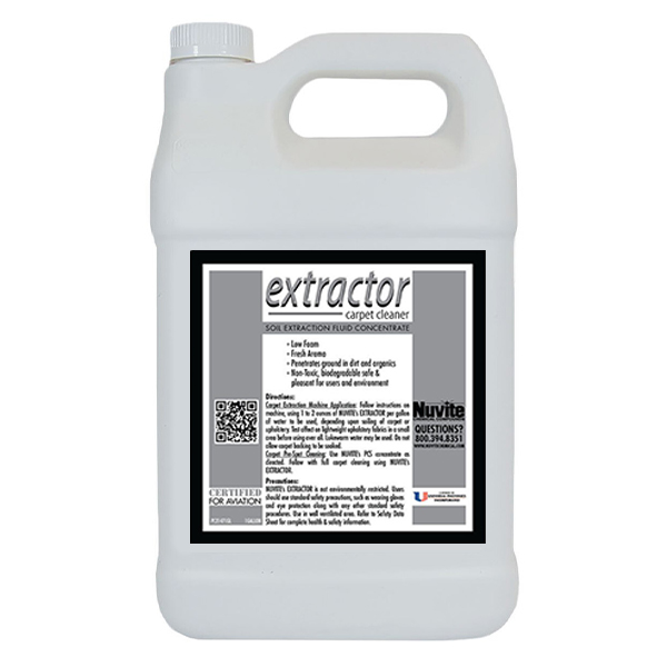 Nuvite Extractor is a professional-grade suction-type soil extraction machine cleaning fluid. Its deep cleaning action makes short work of cleaning both carpeting and heavy upholstery fabrics, and, it keeps machine fouling down due to its low foaming characteristic. The formulation includes color brighteners and a mild, fresh aroma without heavy perfumes. Additionally, Nuvite Extractor helps keep your extraction equipment clean and makes cleanup easy. When you meet those tough cleaning needs in industrial and commercial buildings, or in aircraft, RV, marine, auto and truck applications, you can't do better than Nuvite Extractor. Also works great with the popular small extraction machines and scrubbers for home upkeep use. Supplied in concentrate (1-2 oz. per gallon of water.) |