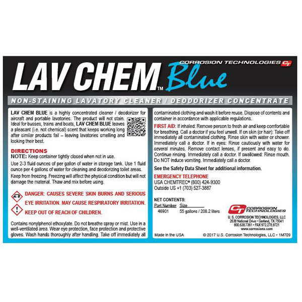 Lav Chem Blue/Clear is a highly concentrated lavatory cleaner and deodorizer for aircraft and portable lavatories / toilets. Ideal for buses, trains and boats, Lav Chem Blue/Clear leaves a pleasant (i.e. not chemical) scent that keeps working long after similar products fail – leaving lavatories smelling and looking their best.