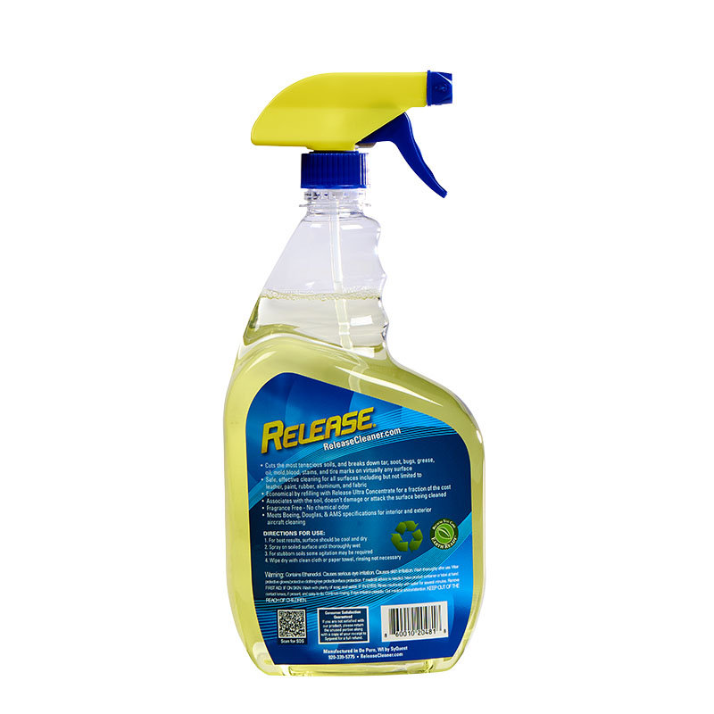 Reach for Release® The most effective aircraft cleaner and degreaser is safe to use on all aviation surfaces due to its advanced associative technology. No more spot testing, it won’t hurt the surface, period. Release® is a ready-to-use non-solvent base product that is formulated for rapid penetration and removal of dirt, grease, grime, oil, exhaust soot, bugs, and organic soils. It works by emulsifying the soil and releasing it from the surface, not attacking it. Release® can be used on interiors and exteriors and is fragrance-free, meaning there is no chemical smell. The list of surfaces Release® can be used on is endless, this is because it contains no phosphates or harmful chemicals and won't stain the surface. It even meets AMS, Boeing, and McDonnell Douglas specifications and is approved for use on Textron brands such as Cessna, Hawker, and Beechcraft. You’ll have peace of mind when using Release® that it won’t stain or damage the surface you’re cleaning. You won’t find a better value in cleaning than Release Ultra®. With the ability to refill your container for as low as 21 cents per refill, Release Ultra® is a great cost-effective choice. SyQuest products come in recyclable containers, do not use aerosol gasses, and are biodegradable. This is part of SyQuest's commitment to preserve our environment and reduce emissions. By purchasing Release Ultra®, we ship less water reducing shipping emissions. It allows ordering fewer products than a normal cleaning concentrate. Do more with Release Ultra®, cut out other cleaning products such as your glass cleaner, interior cleaner, insect cleaner, or even carpet stain remover. |