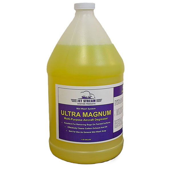 | Ultra Magnum is a non-corrosive, heavy duty alkaline cleaner / degreaser with built in buffers for additional safety. Formulated to rapidly dissolve all carbon, oil, and bugs from the exteriors of aircraft. Ultra Magnum also has built in chelating surfactants that aid in spot free rinsing even when using hard water. |