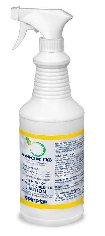 | Sani-Cide EX3 is an EPA registered, broad-spectrum disinfectant and multi-purpose cleaner that is safe to use on most surfaces including metal, plastic (including fire retardant thermoplastics), glass, mirrors, leather, fabric, and carpet. This product offers a safe and effective approach to disinfect hard surfaces while also functioning as a high performance interior cleaner. |