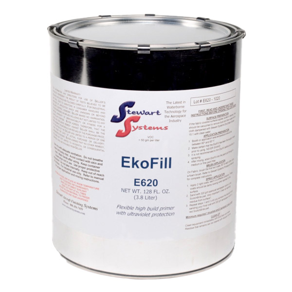 | EkoFill protects the substrate from ultraviolet (UV) radiation by both absorbing and reflecting UV radiation. This is an extremely important characteristic for fabric covered aircraft as well as some composite aircraft and components. During testing for the STC, the complete fabric process containing three crosscoats of EkoFill was tested for UV resistance. That test involved a very intense UV exposure simulating many years of sunlight. The standard for that test is that the fabric can lose up to 20% of it’s tensile strength and pass. The result was that it lost 0.5%! EkoFill is extremely effective at stopping UV radiation and ensuring that fabric and composite components will last for many decades, even when stored outside. Secondly, EkoFill will fill minor imperfections and sand to a smooth, level finish. EkoFill can be used to fill and sand on fabric as well as composite. Thirdly, EkoFill as a primer provides an excellent surface for paint to adhere to. When properly sanded and cleaned, Stewart Systems EkoPoly Premium will bond to the EkoFill with extreme adhesion. EkoFill may be used on fabric, composite, wood, vinyl and many plastics. It is, however, not recommended for application on bare metal as it does not have corrosion inhibiting properties. Because EkoFill does not contain any metallic components, it will not interfere with radio reception or transmission allowing antennas to be mounted under fabric. The natural color of EkoFill is charcoal and therefore cannot be tinted to any other color. |