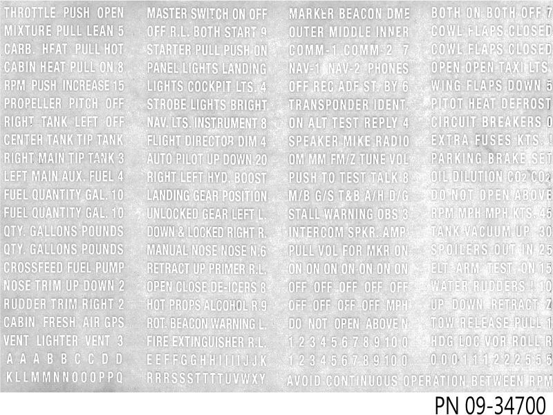 Over 200 pressure sensitive labels and words conveniently grouped for ease of transfer to airplane controls or instrument panel. Available in two type sizes (see illustration) and in black or white lettering (specify).