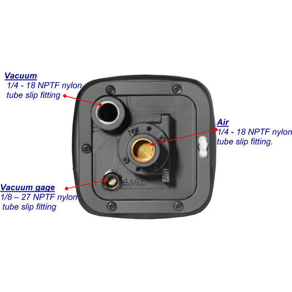 All RC Allen vacuum gyros run off of 4.5" Hg, erect time is 3 min. Instruments equipped with a warning flag will let you know when vacuum has dropped below 3.8" Hg. Flag retracts from view at 4.3" Hg. Instrument fits in a standard 3-1/8" panel cutout. 1/4"-18 NPTF nylon tube slip fitting is recommended for vacuum hose installation. 1/8"-27 NPTF nylon tube slip fitting is recommended for vacuum gage installation.