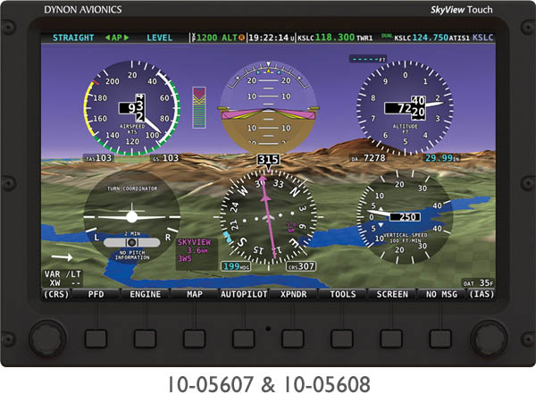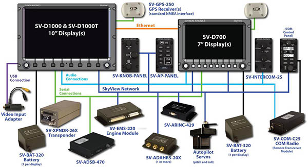 Future Expandability SkyView Overview: Experimental and LSA pilots know that they have the most technologically advanced GA aircraft flying. SkyView continues that tradition with the next generation of glass panels, offering fully redundant networks and systems, incredibly bright screens, design flexibility, and future upgradability unsurpassed by anything else flying. SkyView development is proceeding on course. Mechanical Specifications: Links to mechanical drawings can be found on the left of this page. System Components: The system architecture is shown below. Advanced Screens: Very bright, high-resolution screens driven by advanced graphic processors create highly visible and readable displays. Screen resolutions are 1024x600 for the SV-D1000 10” and 800x480 for the SV-D700 7”. Brightness is over 1350 nits for the 10” display and 1200 nits for the 7” display. Displays are fully dimmable for night flight. A wiring harness included with each display makes for easy connections between displays and modules. Integrated User Interface: Two ten-position control knobs (left, right, up, down, diagonal, push, and rotary) offer easy and intuitive control of your SkyView displays. EFIS, EMS, Autopilot, Moving Map, 3-D Terrain/Synthetic Vision, and menu structures are all available with less than three button presses. Future functionality will include external video display, weather data, traffic, and complete Com radio, Nav radio, and transponder control. SkyView Network: Every SkyView system display and module is connected by two independent power and data buses. The failure of any bus connection or module will result in automatic fail-over to a working bus or module. Total System Battery Backup: The system battery will provide over an hour of backup power to displays and modules. Flexible User Interface: The default screen setups are logical and functional, so you can start flying with a minimum of setup time. But as you determine your preferences and screen layouts, the displayed data can be configured in ways that work best for you. Engine Module: The SV-EMS-220 can be mounted closer to the engine, allowing easier wire routing. Note: the SV-EMS-220 cannot be mounted on the engine side of the firewall. ADAHRS Module: The SV-ADAHRS-200 is a complete MEMS-based attitude reference and air data computer, integrated with a digital compass. This allows easier mounting and higher accuracy calibration between the system components. One or more SV-ADAHRS-201 Modules can be added to a SkyView System for redundancy. GPS Receiver: The SV-GPS-250 connects to the system backup battery for greater reliability. Other NMEA compatible GPS receivers may also be connected to the SkyView system and used in lieu of or redundant to the SV-GPS-250. Compatibility: Your existing Dynon engine monitor sensors and harness will work with the new SV-EMS-220 Engine Module. Your existing Dynon Servos will work with the SkyView system, including a redundant network connection. Your existing Dynon pitot probes will also work with the SkyView system. USB Updates: Convenient program and data updates via USB memory stick. Example Order: Basic two 10” displays with EMS & ADAHRS setup 2 x 10-03932 - SkyView 10” Display (includes main wiring harness) 1 x 10-03939 - SkyView GPS 5Hz Receiver Module (pins into main harness) 1 x 10-03940 - SkyView Backup Battery 2 x 10-03942 - Network Cable – Both ends with connectors, 3’ long* 1 x 10-03938 - SkyView Engine Monitoring Module 1 x Engine Harness – See list below 1 x 10-03936 - SkyView ADAHRS – First ADAHRS 1 x 10-03943 - Network Cable – Both ends with connectors, 6’ long* *Choose appropriate network cable distance. “With connectors” have 9 pin connectors attached at both ends where “with pins only” has one 9 pin connector attached and bare wires at the other end (extra 9 pin connector included “with pins only” cable). |