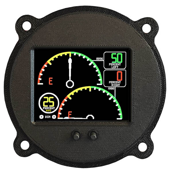 The GEN-2 Fuel Gauge is designed to work with either one or two industry-standard 0 – 5 volt probes, as is common with capacitive probes, or with either one or two industry-standard resistive probes, which are often referred to as float-style probes. Instruments are offered for both 2 1/4" and 3 1/8" panel cutouts. The current fuel level is shown as a standard dial for one or two tanks, along with a digital representation for each tank.