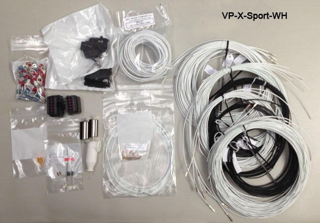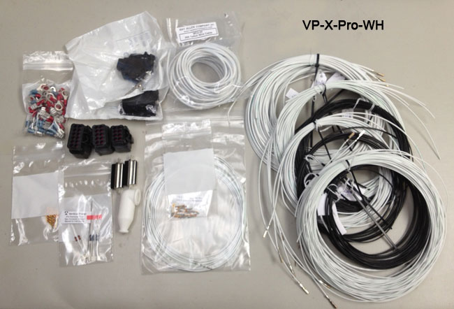 Wiring harness for VP-X-Pro and VP-X-Sport. Includes about 550 feet (VP-X-Sport) 600 feet (VP-X-Pro) of Tefzel wiring, connectors, gold plated terminal pins, 5-conductor trim wire, backshell for connectors, shielded data wire, diodes, rubber boot, and assorted insulated crimp terminals. Wiring harness has power connector terminals crimped on wires.