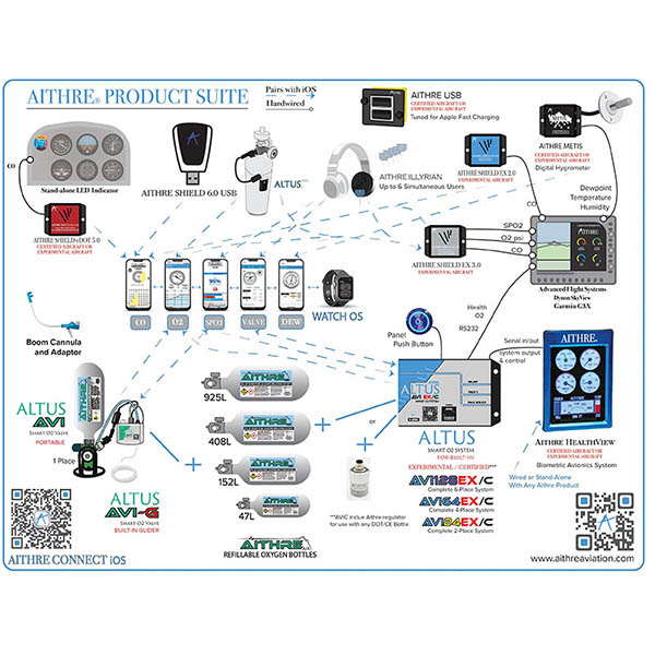 The basis for this unprecedented first-of-its-kind FAA approval for all Part 23 unpressurized aircraft makes and models was on the basis that Aithre's technology of unpressurized station plumbing lines, simple wiring & installation, low current requirements, and remote push-button activation enhances the safety of aviation by making oxygen more accessible during flight. Importantly, the AVI C system is blanket approved for primary use where oxygen is not actually required by the regulations (e.g., below 12,500 MSL for the pilot). Meaning, the AVI C system is available for use where oxygen should be used (e.g., above 5K MSL at night and above 8K MSL during the day). This exciting news means that all Part 23 unpressurized aircraft and owners can now enjoy built-in oxygen with panel-mounted cannula plugs and hidden plumbing lines and an easily removable portable oxygen bottle for filling. Moreover, beyond being neat, tidy, and clean, the Aithre AVI C technology provides incredible never-seen-before endurance through use of microburst MEMS flow sensing technology with biometric feedback. The experimental aircraft world has already been enjoying use of this technology, selected as Product of the Year 2022 by Aviation Consumer Magazine. This includes models such as the Sling TSI and Sling High Wing, Velocity, Vans, Lancair, JMB, Shark, Tarragon, Risen, but now the same technology is available in the Part 23 certified aircraft market. SYSTEMS OVERVIEW The Altus AVI C is the first installed smart oxygen system that is FAA-approved for aftermarket installation in every make and model Part 23 unpressurized aircraft. The AVI C features a push button remote on/off button and indicator, a wireless Altus Meso pressure gauge, and a complete kit for portable bottle mounting, including cannula plugs, bottle mounts, plumbing lines, cannula fittings, and the AVI C control system with in-app monitoring and biometric feedback using the Aithre Connect iOS app. MORE PERMANENT SEMI-BUILT-IN SYSTEM AVI C is designed as a a more permanent semi-built-in oxygen system. We coined the term semi-built-in to describe the oxygen system because the plumbing is hidden while the bottle is accessible and removable. This is an improvement of the fully-built-in systems because the bottles are easier to fill at small FBOs or to remove when not needed, yet the install is clean, tidy, and professional. However, the AVI C is otherwise a fully-built-in system because the control box is ship powered and the plumbing lines are routed behind paneling and concealed with panel-mounted cannula plugs. ALL INCLUSIVE EXCEPT BOTTLE The AVI C system provides everything you need to have a built-in smart oxygen system for your certified aircraft except the bottle: custom Mountain High oxygen regulator, control unit, Healthview avionics, plumbing, mounts, cannulas, fittings, control button indicator, and iOS app. While the Mountain High regulator is included, the bottle itself is not and can be any DOT bottle that is marked for aviation use. This enables the AVI C to use an existing oxygen bottle or purchase another one specific to your mission endurance needs. TWO OR FOUR OR SIX PLACE Each place includes an independent smart pulse circuit and a 100% silicone soft cannula to ensure the total comfort of you and your passenger without any stiffness - even maintaining supreme flexibility at low temperatures. HEALTHVIEW The Healthview is the first dedicated avionics display for health information, including gauges for blood oxygen, heart rate, respiration rate, flow rate, cabin pressure, cabin temperature, carbon monoxide, oxygen tank pressure, and wing tip temperature/dewpoint spread - and the first dedicated avionics display that controls your oxygen dosage per station based on altitude, carbon monoxide, blood oxygen, and heart rate. The Healthview features a 240 x 320 pixel TFT resistive touch LCD display with rich and vibrant graphical gauges, enclosed in an ultra-compact aluminum anodized laser etched case. The Healthview is powered by three parallel low energy processors and a wireless communication module for an exciting low heat, low power, high functionality display, using only 150mA of current at 14V. Available as either in portrait or landscape orientation, the Healthview will fit in any panel design. The portrait or landscape orientation must be selected on purchase as a variant and is not changeable in the field. The Healthview works as a standalone device for cabin pressure altitude, using an internal barometric pressure sensor. But, the real power lies in the Healthview's ability to dynamically expand to feature any available Aithre device, wirelessly and with OR without use of the popular Aithre Connect iOS app. The Healthview is compatible with all Aithre devices, including the Shield series of carbon monoxide detectors, the Illyrian oximeter, the Meso oxygen pressure, the AVI oxygen systems, and the Metis wingtip temperature/dewpoint sensor. Up to six Illyrian oximeters can be linked to the Healthview at any moment. Many of the connections are wireless, but the Healthview also features serial channels linking directly to the AVI. Additionally, the Healthview controls the built-in AVI with dedicated serial communication, including pulse dosage based on pressure altitude and blood oxygen saturation levels. For advanced oxygen users, the Healthview provides an auto mode functionality that automatically turns your oxygen on and off on a station-by-station basis, using parameters of pressure altitude, SPO2, heart rate, and carbon monoxide. You'll be proud to feature the elegant aluminum housing on your panel and it won't tax your battery. Power requirements are 12-18V and only 150 mA (0.15 A). Dimensions are 90mm x 61mm x 21.5mm and weight is just under 6 ounces. SMART PULSE Our smart pulse system is the first ever to base pulsed oxygen on MEMS flow measurements. This technology provides enhanced inhalation detection plus provides real