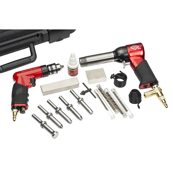 For perfect riveting jobs, ATS gives you the ATS Pro Rivet Gun with feather trigger (including springs), two of ATS most popular Tungsten bucking bars, and a full set of riveting snaps. Included is a set of rivet gauges to make sure you get things right, and a bottle of oil to keep those tools running at peak performance.