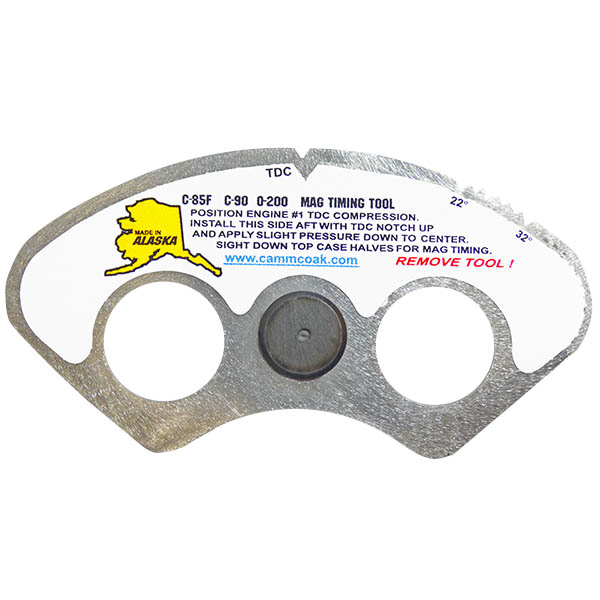 Aluminum CNC tool manufactured in Alaska for simple and perfect magneto timing. Very easy to use! Simply position engine on #1 TDC compression stroke. Lube grommets. Put this tool on the top two propeller nuts and sight down top case halves to see exact mag timing. Now there's no need for propeller protractor cones! |