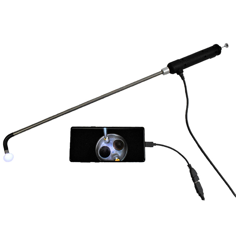 | Vividia Ablescope VA-400 v5, ideal for detailed visual inspection in hard-to-reach places such as car engines with 180 Degree articulation 8.5mm diameter steel probe and 8 bright LED lights. The 180 degree bending back probe camera with LED lights makes it possible to inspect the back side of an dark inside compartment. |