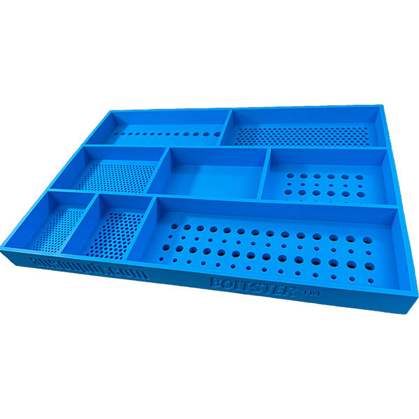 • Additionally, the Boltster Top Box Tray has one central area without an organizing pattern which is a dedicated “catch-all” area. Any loose nuts, bolts, screws, wrenches, etc. can all be held securely here. Most tool trays on the market have a 25mm sidewall height. Boltster offers a 41mm, which is one of the best in its class. Almost nothing will roll out of this tray!
