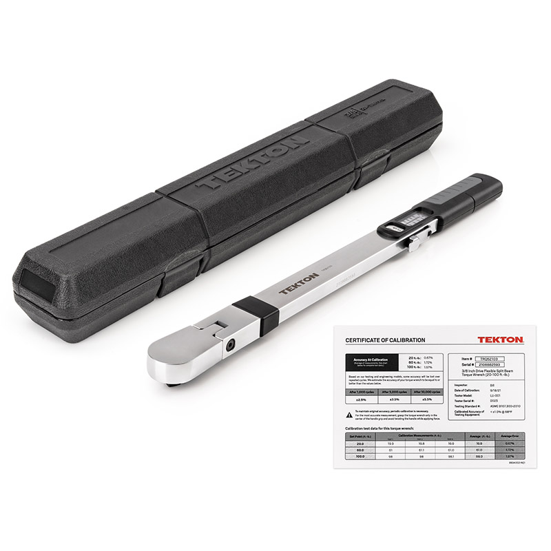 ![]() Serialized Certificate of Calibration Each wrench is calibrated according to the ASME B107.300-2010 standard. The detailed test results are recorded on the included certificate. ![]() Design and Components ![]() How it Operates As force is applied to the handle, the wrench flexes until the catch contacts the calibration set screw. This disengages the anchor beam from the main beam, causing it to spring into the wrench body and produce a "click" sound. Flex Head The flex head offers the clearance to work around nearby obstructions. ![]() |