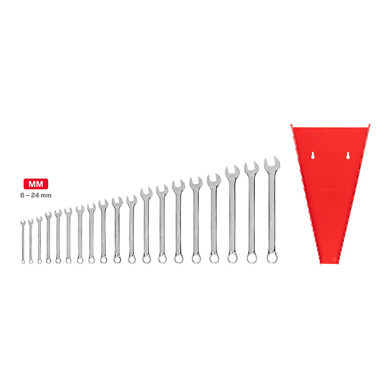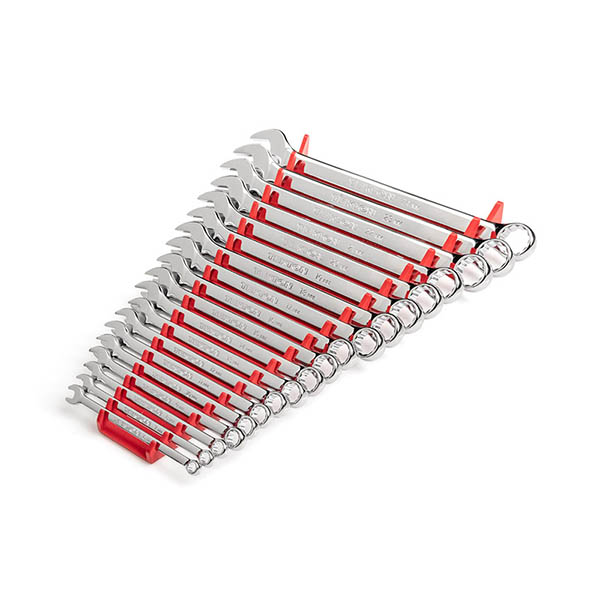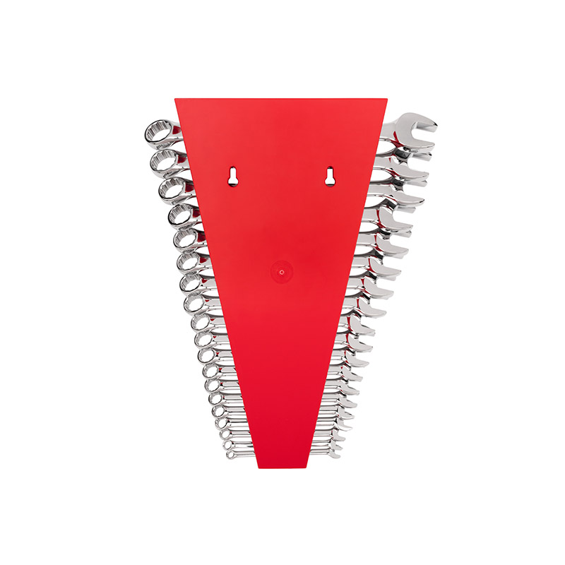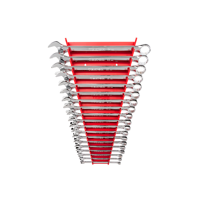 Angled Open End To reduce the working swing arc in tight spaces, the open end is angled 15 degrees so the wrench can be flipped over with each rotation to engage the fastener twice as often. ![]() 12-Point Box End A 12-point box end doubles the available access angles, as compared to a 6-point end. In order to prevent rounding off fasteners, the box end is designed to contact and apply force to the sides of a fastener head and not the corners. ![]() Offset Box End The box end is offset 15 degrees, creating clearance for your fingers and making it easier to reach around obstructions. ![]() Storage FeaturesQuick-Access Wrench SlotsThe wrenches rest in slots, making it easy to take the tools in and out without resistance. ![]() Fits in 2-Inch Drawers The low-profile wrench rack fits into most shallow tool cabinet drawers. ![]() |