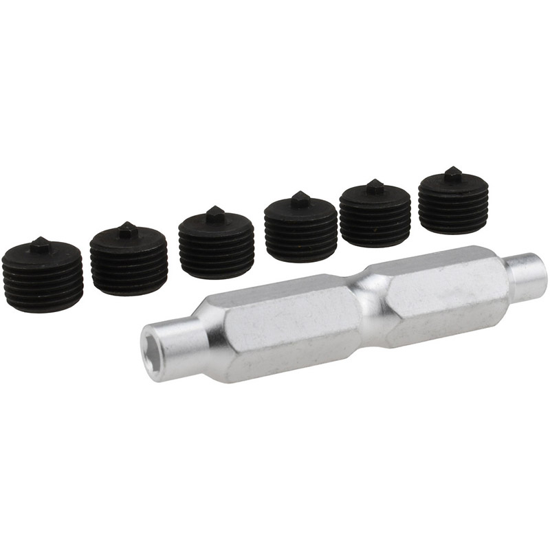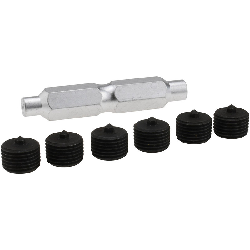 Ideal for use in layout, tool and die work; also can be used for locating fixtures, air cylinders, chucks, and general repairs. Aids in locating the die in proper relation to the punch on commercial die sets. Black oxide surface treatment. Hardness 48~52HRC. Complete set consists of four or six hardened hardened screws nested in a combined holder and wrench. |