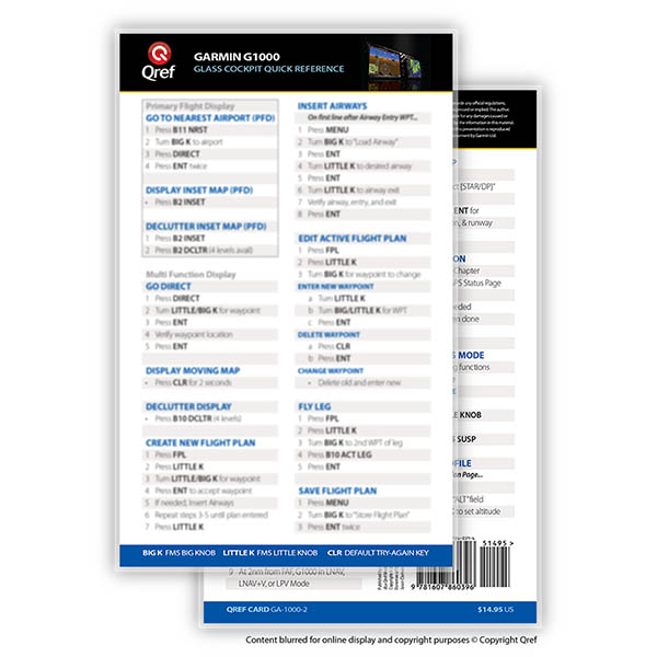 Book vs. Card Now you've got a choice. Our quick reference books feature easy-to-use tabbed pages for concise procedures and navigation help in a compact size, prefect for someone who wants complete information or is new to a system. Our new cards provide all the essential information in a 5" x 8" full-color, hard plastic card for those who are already familiar with their system. Either way, Qref keeps you in the know, quickly and easily. Expert tips, helpful procedure Qref Quick Reference checklists are the first and only procedure checklist dedicated to helping you get the most from your avionics. Our team of experts provide detailed, how-to steps for nearly every feature, and our thoughtful design guides you through each screen, menu, and step. Crushproof Binding Qref checklists are spiral bound at the top for security and easy, smooth page turning. Unlike metal binding, our spiral binding will not crush or let pages slip out. The Perfect Size At 4.5" (114mm) wide and 8" (203mm) tall, Qref checklists are the perfect size for your kneeboard, yoke clip, or gear bag. The large type was designed for maximum readability and clarity while fitting everything you need into a compact checklist. Tabbed Sections Information is organized into standardized sections, and each section is tabbed in sturdy 1/4" (60mm) side tabs, making it easy to navigate to the exact procedure you're after. Indestructible Laminate A industrial-grade 5mil matte laminate protects the front, back, and tabs. Inside pages are laminated with a 1.7mil matte finish that reduces glare and improves readability. Table of Contents and Index The full table of contents inside, and handy index on the back cover, get you to the most commonly used procedures quickly. "You Are Here"™ A unique feature is a special section that intelligently displays all possible screens and how to navigate through them. Never get lost inside your GPS again! Unit Overview See at-a-glance which button does what and discover hidden short cuts and features. |