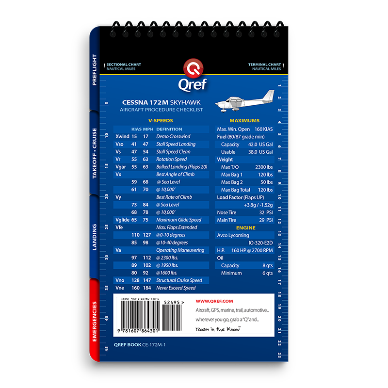 Qref BooksTopics Covered: Preflight, Takeoff/Cruise, Landing, Comprehensive Abnormals and Emergencies, V-speed list, cruise performance chart Get the most accurate, reliable aircraft checklist on the market with a Qref checklist. The procedures cover every aspect of flight, from preflight through takeoff, cruise, landing, and a comprehensive emergencies/abnormals section. Emergencies are arranged by system, meaning no more digging through pages to find the right section. Qref’s trademark is creating checklists that are easy for pilots to use. A major difference in aircraft checklists between Qref and others is the level of experience and expertise that go into every procedure. The Qref team of Master CFIs have over four decades of combined active flight instruction and flying experience at all levels of industry, with instruction and flight time in this aircraft. Further, they have taken advantage of the past 20 years of checklist design research. Qref’s team incorporates industry-best practices into these checklists and forthcoming publications. They not only create checklists, they use them in daily instruction and flying. Qref checklist design features a larger, more readable font, comprehensive procedures sectioned into tabs loaded with useful reference and conversions, and non-glare laminated pages. A complete table of contents makes finding the exact procedure quick. Find out for yourself why Qref aircraft checklists are fast becoming the Gold Standard in aviation. Qref CardsTopics Covered: Preflight, Takeoff/Cruise, Landing, Abnormals and Emergencies, V-speed list 2-card set: one for standard procedures, one for abnormals and emergencies. Q'Cards are designed for pilots who are already familiar with the aircraft but need an everyday checklist to keep relevant procedures at their fingertips. 5" x 9" (12.7 cm x 22.8 cm), the prefect size to fit on a yoke mount or kneeboard. Indestructible proprietary 10-mil laminate with non-glare, UV protective treatment means these checklists will withstand years of use. No other checklist has this! A major difference in aircraft checklists between Qref and others is the level of experience and expertise that go into every procedure. The Qref team of Master CFIs have over four decades of combined active flight instruction and flying experience at all levels of industry, with instruction and flight time in this aircraft. Further, they have taken advantage of the past 20 years of checklist design research. Qref’s team incorporates industry-best practices into these checklists and forthcoming publications. They not only create checklists, they use them in daily instruction and flying. Find out for yourself why Qref aircraft checklists are fast becoming the Gold Standard in aviation. |