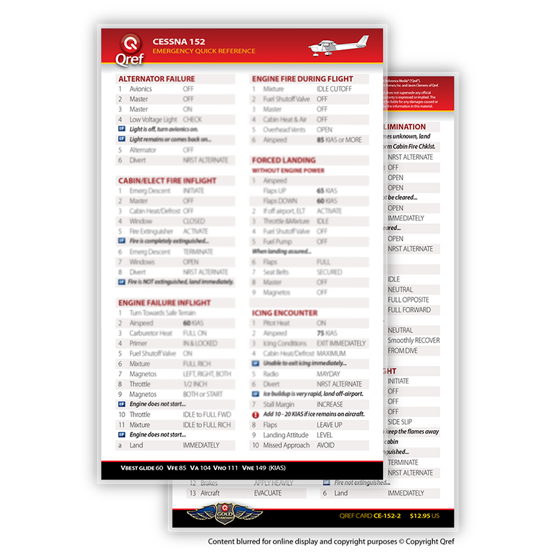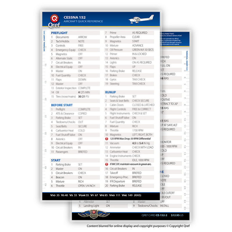 Qref BooksTopics Covered: Preflight, Takeoff/Cruise, Landing, Comprehensive Abnormals and Emergencies, V-speed list, cruise performance chart Get the most accurate, reliable aircraft checklist on the market with a Qref checklist. The procedures cover every aspect of flight, from preflight through takeoff, cruise, landing, and a comprehensive emergencies/abnormals section. Emergencies are arranged by system, meaning no more digging through pages to find the right section. Qref’s trademark is creating checklists that are easy for pilots to use. A major difference in aircraft checklists between Qref and others is the level of experience and expertise that go into every procedure. The Qref team of Master CFIs have over four decades of combined active flight instruction and flying experience at all levels of industry, with instruction and flight time in this aircraft. Further, they have taken advantage of the past 20 years of checklist design research. Qref’s team incorporates industry-best practices into these checklists and forthcoming publications. They not only create checklists, they use them in daily instruction and flying. Qref checklist design features a larger, more readable font, comprehensive procedures sectioned into tabs loaded with useful reference and conversions, and non-glare laminated pages. A complete table of contents makes finding the exact procedure quick. Find out for yourself why Qref aircraft checklists are fast becoming the Gold Standard in aviation. Qref CardsTopics Covered: Preflight, Takeoff/Cruise, Landing, Abnormals and Emergencies, V-speed list 2-card set: one for standard procedures, one for abnormals and emergencies. Q'Cards are designed for pilots who are already familiar with the aircraft but need an everyday checklist to keep relevant procedures at their fingertips. 5" x 9" (12.7 cm x 22.8 cm), the prefect size to fit on a yoke mount or kneeboard. Indestructible proprietary 10-mil laminate with non-glare, UV protective treatment means these checklists will withstand years of use. No other checklist has this! A major difference in aircraft checklists between Qref and others is the level of experience and expertise that go into every procedure. The Qref team of Master CFIs have over four decades of combined active flight instruction and flying experience at all levels of industry, with instruction and flight time in this aircraft. Further, they have taken advantage of the past 20 years of checklist design research. Qref’s team incorporates industry-best practices into these checklists and forthcoming publications. They not only create checklists, they use them in daily instruction and flying. Find out for yourself why Qref aircraft checklists are fast becoming the Gold Standard in aviation. |